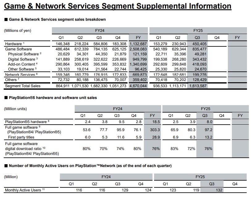 La compañía también informó de 132 millones de usuarios activos mensuales en PlayStation Network a 31 de diciembre de 2025. Esta cifra supone un aumento de tres millones en comparación con el mismo periodo del año fiscal anterior.