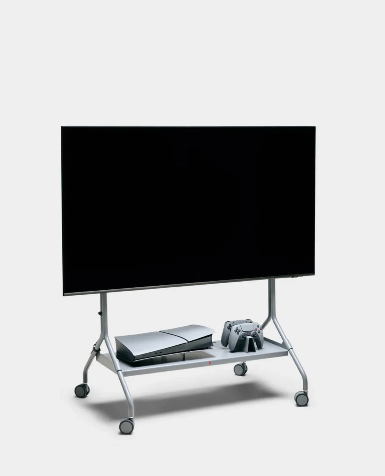 El pedestal está fabricado en acero inoxidable con recubrimiento de polvo, lo que lo hace especialmente robusto y duradero. Con un peso de unos 15 kilogramos, el soporte es adecuado para televisores con una diagonal de pantalla de 40 a 70 pulgadas. Las cuatro ruedas hacen que el pedestal sea fácil de mover, perfecto si hay que guardar todo el equipo de juego en un trastero o trasladarlo a otra habitación. Un estante bajo el televisor ofrece espacio para una PlayStation 5 y otros accesorios