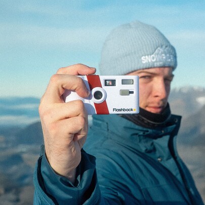 A primera vista, la Flashback One35 V2 parece una cámara compacta analógica de 35 mm, disponible en ocho colores diferentes, dos de los cuales son incluso parcialmente transparentes. Incluso el embalaje tiene un diseño retro. Un pequeño visor óptico y la ausencia de pantalla ocultan las partes digitales de la cámara.