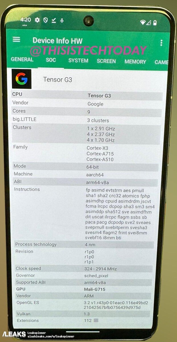 Empezando por lo básico, el Google Pixel 8 Pro de la filtración cuenta con 12 GB de RAM y 128 GB de almacenamiento. Bajo el capó se encuentra Tensor G3 sin núcleo de Googlede Google, con cuatro núcleos Cortex-A510 a 1704 MHz, cuatro núcleos Cortex-A715 a 2367 MHz y un núcleo principal Cortex-X3 a 2914 MHz. La GPU es la Mali-G715.