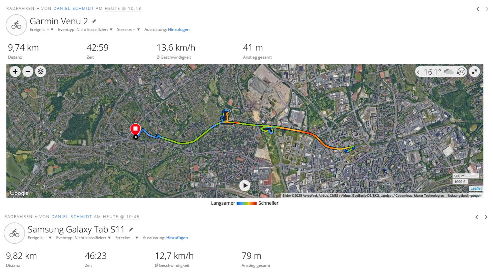 Para probar su precisión, llevamos la tableta Galaxy a dar un paseo en bicicleta con un Garmin Venu 2. La Tab S11 trazó nuestra ruta de forma fiable, aunque se apreciaron algunas desviaciones.