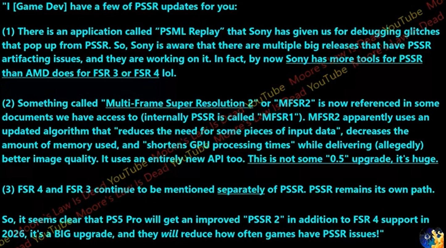 Moore's Law Is Dead fue el primer filtrador que reveló en detalle la Superresolución Espectral de PlayStation (PSSR) antes del debut de la PS5 Pro. En mayo de 2025, el filtrador informó de que Sony estaba desarrollando la PSSR2 para lograr una mejor calidad de imagen utilizando menos recursos. MLID ha alegado ahora algunos detalles más sobre el PSSR2.