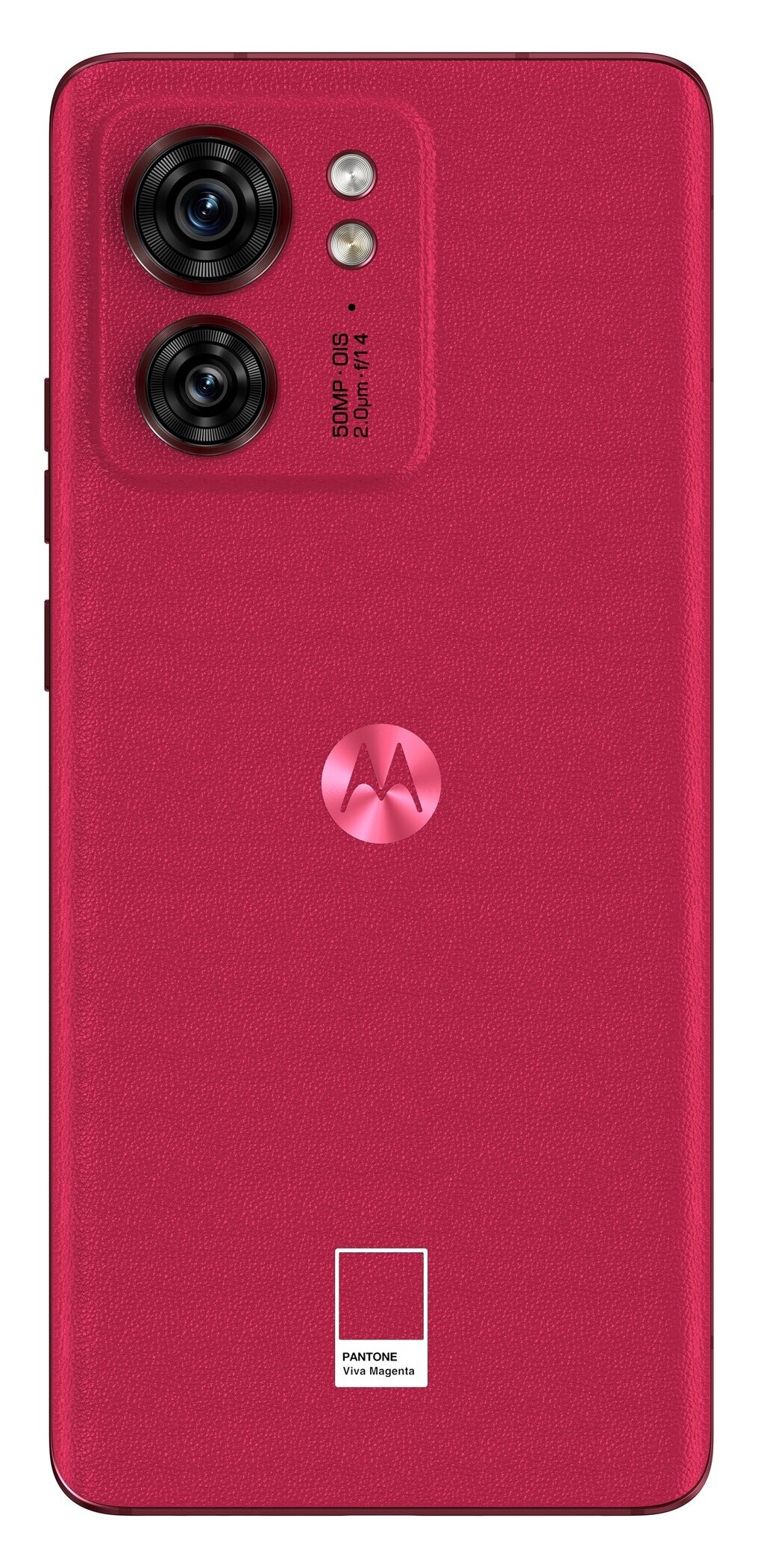Motorola también seguirá utilizando el color del año 2023 de Pantone, que denomina "Viva Magenta". En consecuencia, Motorola incluirá la marca Pantone bajo su logotipo. Además, el Viva Magenta mantendrá su acabado de cuero vegano, que también estará disponible en negro Eclipse y verde Nebula. Por alguna razón, la opción de color azul claro, que se rumorea que se venderá como Lunar Blue, carecerá de acabado de cuero vegano.