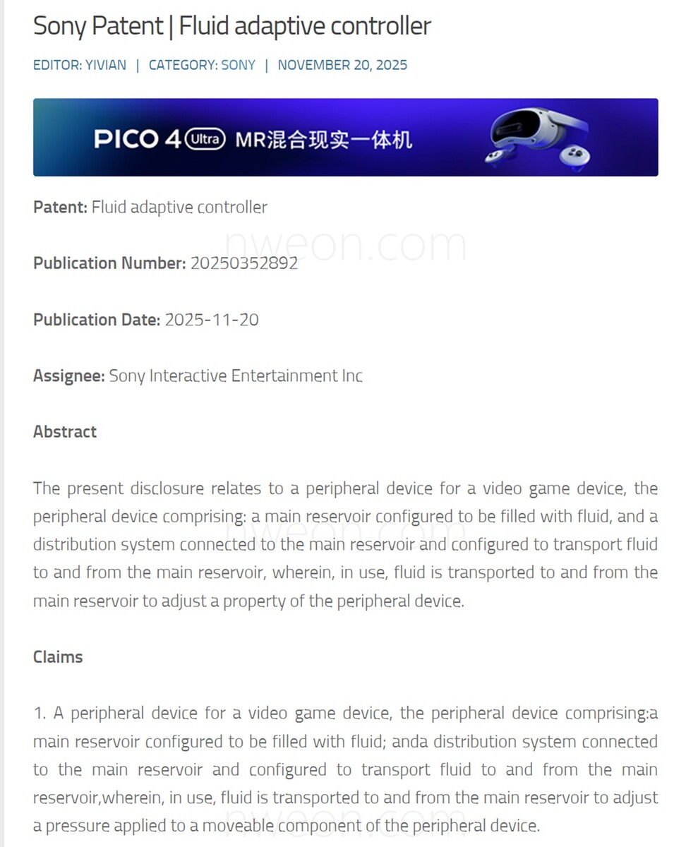 Los documentos vistos en los foros de ResetEra tienen fecha de publicación del 20 de noviembre. Los accesorios que podrían mostrar la tecnología Fluid Adaptive podrían parecerse al DualSense o al mando VR2 Sense. Cada dispositivo tendría un depósito central de fluido, con la opción de fluir a cámaras secundarias. Los compartimentos más pequeños están directamente junto a los sticks analógicos o los botones faciales.