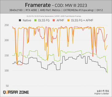 Además de Cyberpunk 2077, el conjunto de pruebas incluía juegos como CoD Modern Warfare III, Ratchet & Clank: Grieta Aparte y Starfield. DLSS FG + AFMF produjeron claramente la mayor cantidad de fotogramas en todos los juegos (si no por mucho en algunos casos), pero no puede decirse lo mismo de los 1% bajos. En CoD MW III, por ejemplo, los 1% bajos fueron inferiores a los de AFMF o FG probados por sí solos. Los chicos de Quasar Zone señalan que en las pruebas ni siquiera se utilizó el escalado ascendente, por lo que los fps medios pueden mejorarse aún más mediante los métodos de escalado ascendente DLSS y FSR. Hay un gráfico en particular que muestra cómo AFMF aún no es eficaz en escenas con movimientos rápidos de la cámara, provocando caídas drásticas de fotogramas debido a que el controlador desactiva dinámicamente la función.