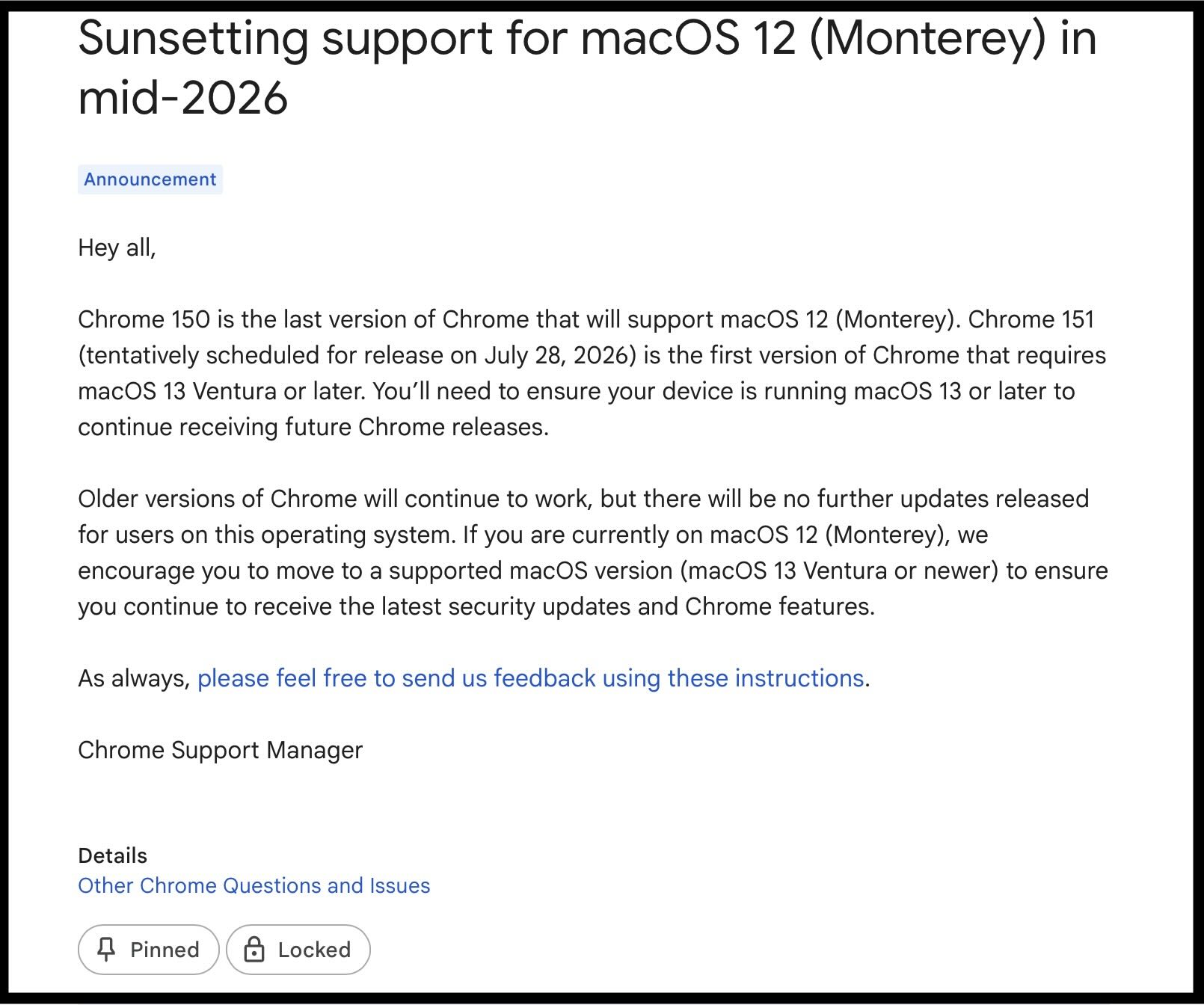Los usuarios de Google Chrome en sus Mac anteriores a 2018 tendrán que enfrentarse muy pronto a un desafortunado acontecimiento. Según una actualización reciente de https://support.google.com/chrome/thread/404150391/sunsetting-support-for-macos-12-monterey-in-mid-2026 en la página oficial de soporte de Google para Chrome, Chrome 150 será la última versión del popular navegador web compatible con macOS 12 Monterey.