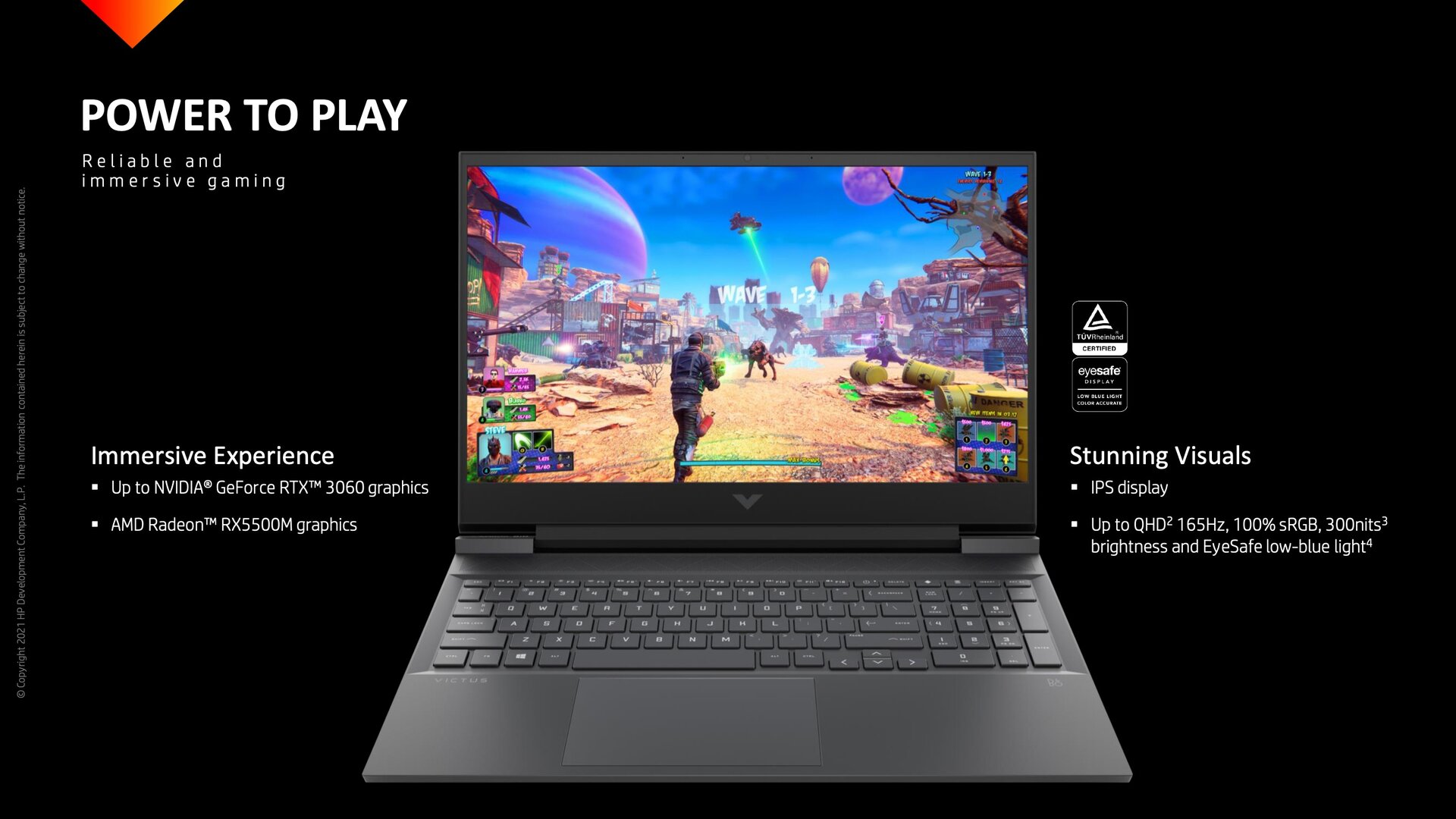 El Victus by HP 16 ofrece opciones de visualización hasta una pantalla IPS QHD de 165 Hz con cobertura 100% sRGB, 300 nits de brillo y emisiones de luz azul bajas EyeSafe. Los compradores pueden elegir entre Intel Core i7-11800H y AMD Ryzen 7 5800H que pueden combinarse con hasta 32 GB de memoria DDR4-3200. En cuanto a los gráficos, Victus by HP 16 permite seleccionar entre una GPU NVIDA GeForce RTX 3060 para portátiles y una AMD Radeon RX 5500M. HP dijo que está utilizando un flujo de aire de 5 vías con un diseño de 4 tubos de calor para mejorar las térmicas. La base del dispositivo ofrece una entrada de aire un 70% mayor para alimentar las opciones gráficas de 60 W y 80 W.