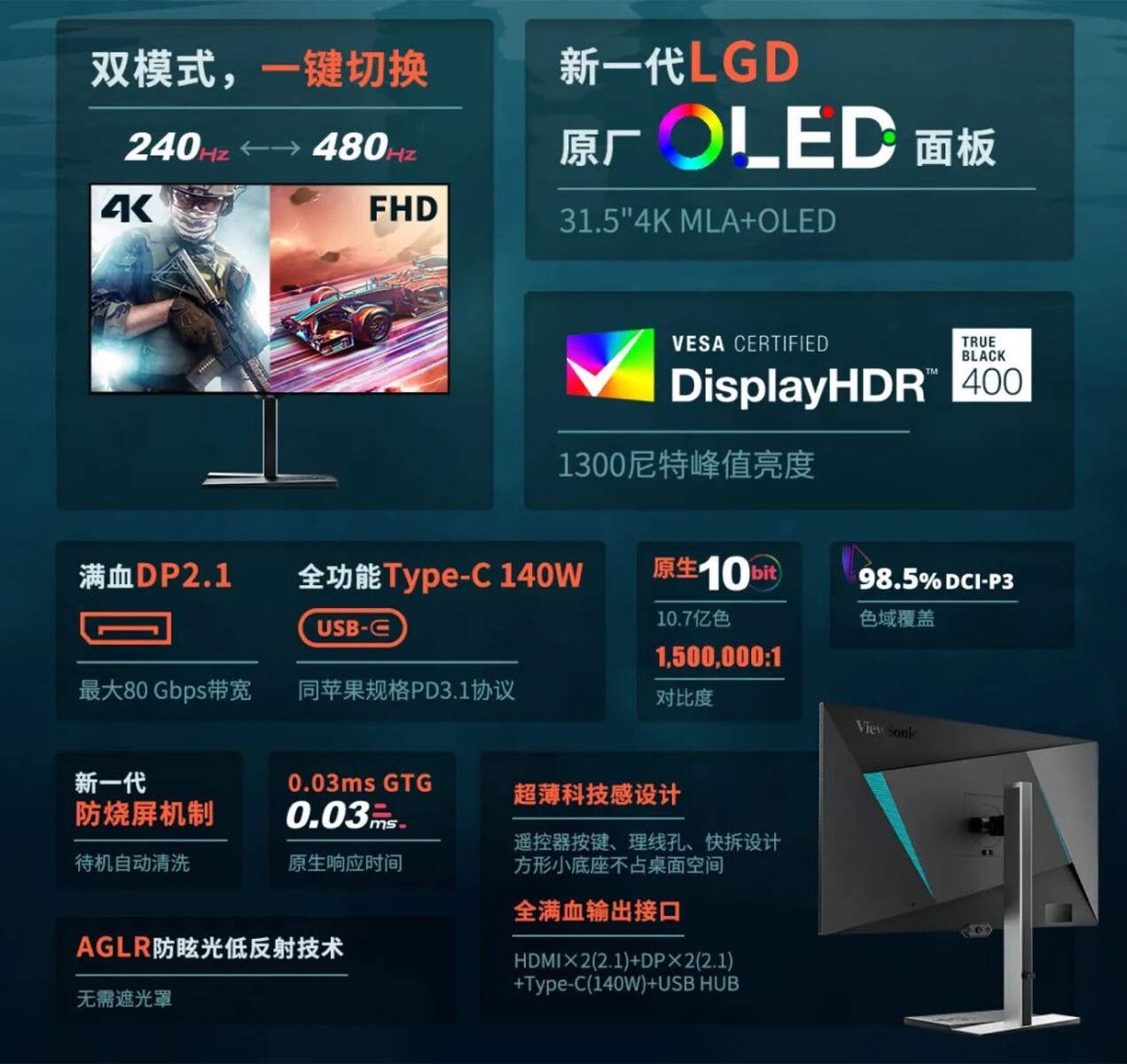 Además, ViewSonic incluye un par de puertos DisplayPort 2.1 con un ancho de banda de 80 Gbit/s cada uno, a diferencia de muchos de sus contemporáneos. Además, el XG323-4K-OLED2 también cuenta con un par de puertos HDMI 2.1 y un único puerto USB Type-C que puede cargar los dispositivos conectados a una potencia de hasta 140 W. Por si fuera poco, ViewSonic equipa el monitor con un par de altavoces de 5 W, un concentrador USB de 3 puertos y un soporte ajustable. De momento, ViewSonic sólo ha puesto a la venta el monitor en China, donde se vende por 10.999 CNY (~1.513 dólares). Dicho esto, la empresa tiende a ofrecer sus monitores en todo el mundo en algún momento.