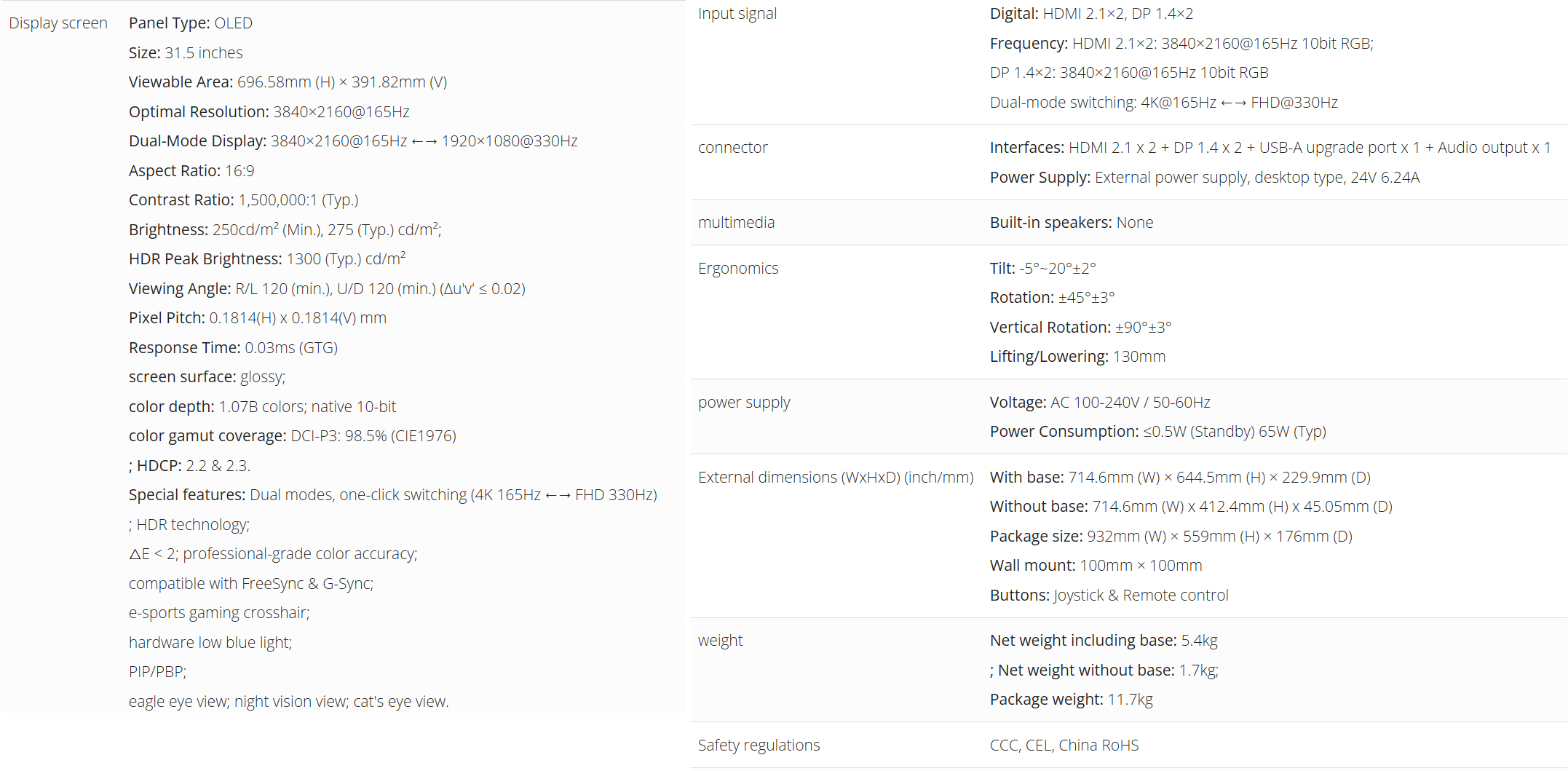 Aunque el monitor para juegos más reciente conserva un panel OLED con modos duales, puede ofrecer una frecuencia de actualización de 330 Hz en modo de resolución 1080p y de 165 Hz en 4K. Para comparar el XG323-4K-OLED2 que se lanzó el año pasado puede llegar hasta 480 Hz en el modo FHD y 240 Hz en 4K.