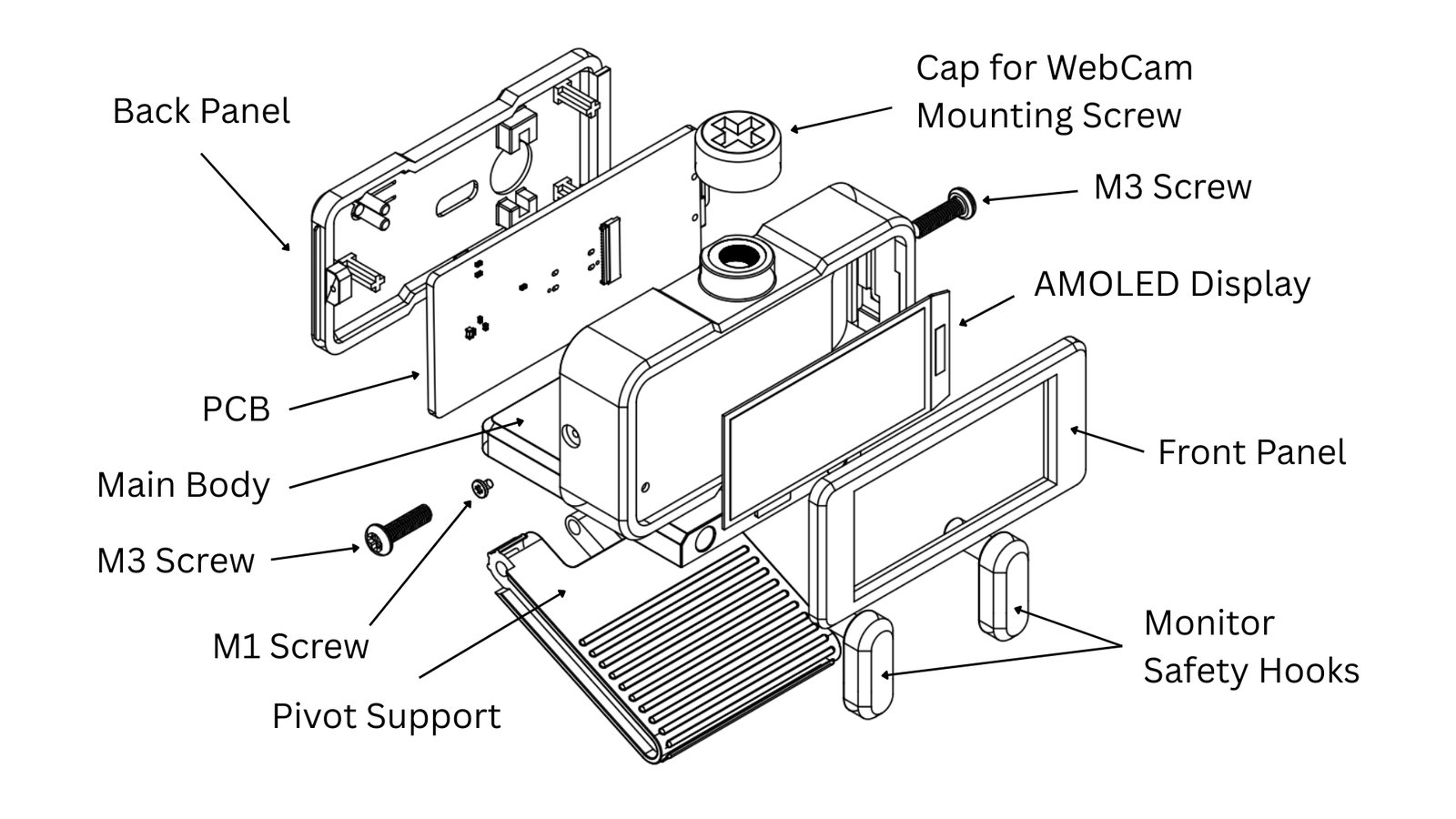 El dispositivo mide 68 x 60 x 54 mm y pesa unos 100 gramos. Se alimenta y conecta mediante USB-C, con un diseño de montaje en la parte superior del monitor que permite apilar cámaras web. Todos los componentes de hardware y software son de código abierto y se publican bajo licencias permisivas para facilitar las contribuciones de la comunidad. Un IDE de serie dedicado permite codificar y depurar JavaScript en directo sin necesidad de extraer la tarjeta microSD.