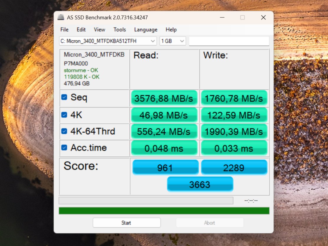 ¿Y para qué sirve todo este proceso? La respuesta depende en gran medida de la configuración específica del sistema. Según un informe de Heise publicado en https://www.heise.de/news/SSD-Nachbrenner-Auch-Windows-11-hat-Microsofts-neuen-NVMe-Treiber-11121353.htmlfue posible un aumento de entre el 10 y el 15% en la velocidad de los datos con una unidad SSD PCIe 4.0 en una estación de trabajo. Según las pruebas de la publicación alemana, una unidad SSD PCIe Gen 3.0 también se benefició de este truco. Mi portátil Acer Swift 16 Edge está equipado con dos unidades SSD Micron 3400 PCIe 4.0, una con 1 TB y otra con 512 GB de capacidad de almacenamiento.