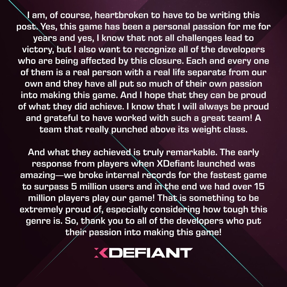 "A pesar de un comienzo alentador, el trabajo apasionado del equipo y una base de fans entregada, no hemos sido capaces de atraer y retener a un número suficiente de jugadores para competir en el exigente mercado de los FPS free-to-play. Como resultado, el juego está demasiado lejos de lograr los resultados necesarios para justificar una inversión adicional significativa, y anunciamos que vamos a interrumpir el juego", reza un comunicado de https://news.ubisoft.com/en-au/article/1EywTnGrZdDqCoxKs2zNhZ/ubisoft-discontinues-development-on-xdefiant sobre la discontinuación de XDefiant en la página web de Ubisoft.