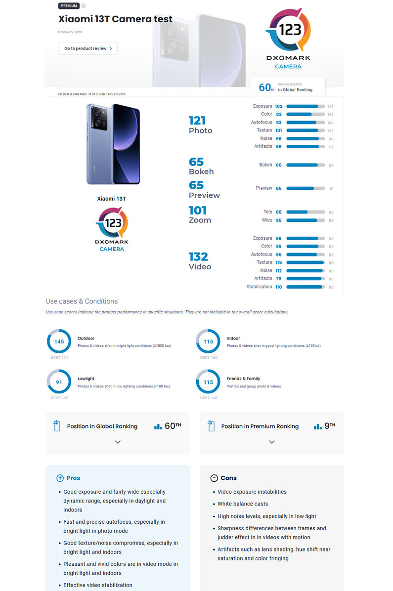 Por desgracia para Xiaomi, las pruebas de DxOMark revelan varios puntos débiles, ya sean las pantallas, la duración de la batería o las cámaras. Por ejemplo, el Xiaomi 13T obtuvo 123 puntos en las pruebas de cámara del sitio web, lo que lo sitúa en el puesto 60 de la clasificación general y en el noveno de la clasificación premium de entre 600 y 800 dólares, a pesar de contar con un sistema de cámara Leica profesional. Sorprendentemente, esta puntuación sitúa a la Xiaomi 13T por detrás de la Xiaomi 12T Proque ocupa el cuarto lugar entre los smartphones de gama alta.