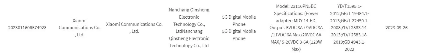 Como referencia, el 23116PN5BC será un dispositivo exclusivo de China, denotado por su sufijo "C". Sin embargo, se supone que Xiaomi ofrecerá una variante global en algún momento, probablemente a principios de 2024. Aunque es probable que todas las variantes del Xiaomi 14 Pro incorporen diversas mejoras con respecto alXiaomi 13 Prola carga por cable no será una de ellas. Según 3C, Xiaomi certificó el 23116PN5BC con MDY-14-EDun cargador con una potencia máxima de 120 W.