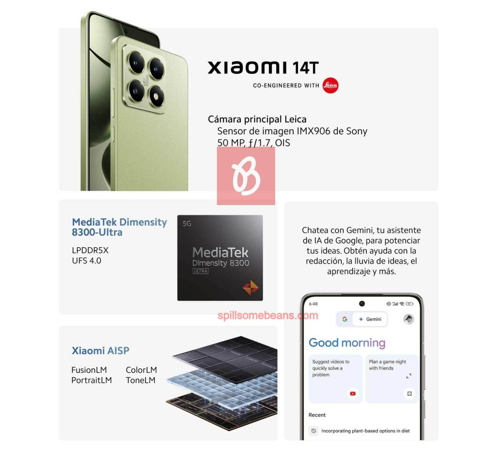 Por un lado, Spill Some Beans ha filtrado varias imágenes promocionales en español. Aunque se centran principalmente en el hardware de la cámara, también confirman que Xiaomi planea anunciar la serie Xiaomi 14T como compatible de fábrica con la función "Círculo para buscar" de Google. Además, el Xiaomi 14T y el Xiaomi 14T Pro soportarán de forma nativa otras funciones centradas en la IA, como la toma de notas asistida y el software de interpretación.