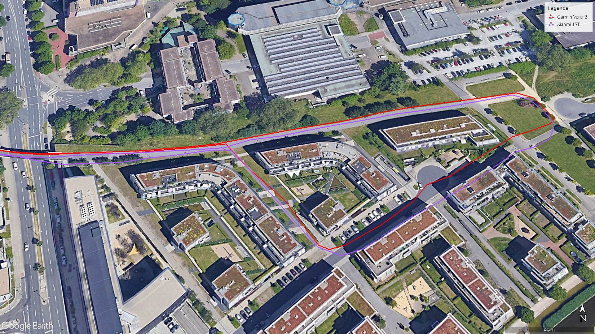 El teléfono Xiaomi realiza rápidamente una Satfix en exteriores con una gran precisión de 1 metro. En nuestra prueba práctica, comparamos el Xiaomi 15T con un smartwatch Garmin (Venu 2). Ambos presentan algunas imprecisiones, pero el posicionamiento del teléfono de gama media es más que suficiente para las tareas de navegación.