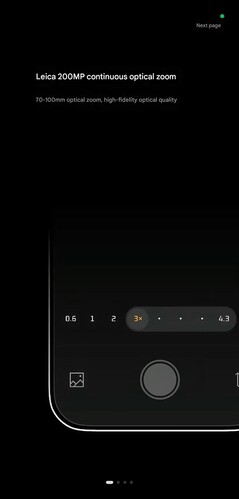 En las imágenes que aparecen a continuación, además de las habituales posiciones de zoom de 0,6x, 1x y 2x, también se puede ver un rango entre zoom 3x y zoom 4,3x, que parece cubrir distancias focales entre 70mm y 100mm y se complementa con otro zoom 8,6x. Además, se mencionan específicamente un "zoom óptico continuo Leica de 200 MP" y una "calidad óptica de alta fidelidad", por lo que Xiaomi no está ofreciendo un rango de zoom mayor que en la Xiaomi 15 Ultra, sino aparentemente un zoom de mayor calidad.