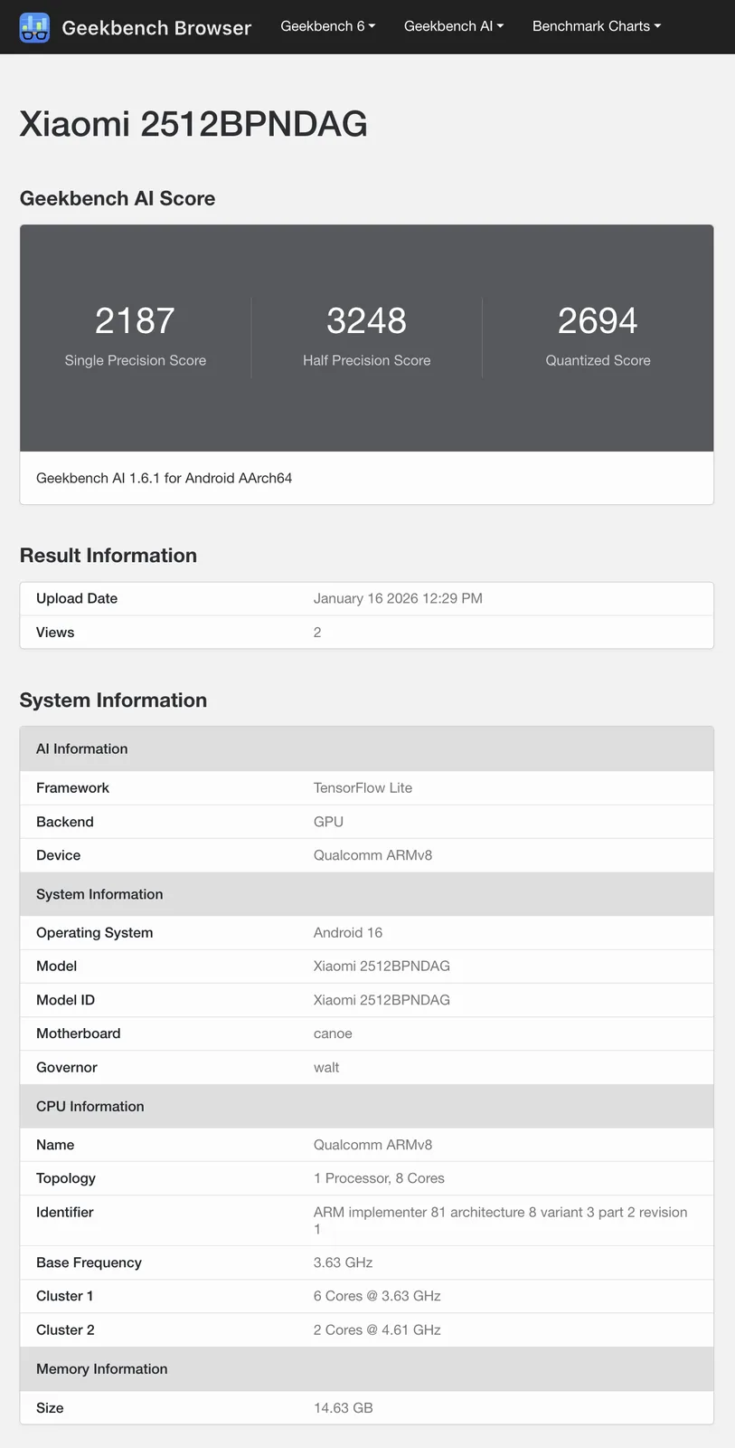 Sin embargo, la versión global del Xiaomi 17 Ultra ha aparecido ahora en Geekbench. Identificable por su número de modelo 2512BPNDAG, actualmente se espera que la variante global se una únicamente al Xiaomi 17 fuera de China. Como era de esperar, el Xiaomi 17 Ultra mantiene un Qualcomm Snapdragon 8 Elite Gen 5 chipset en su variante global. Además, el dispositivo estará disponible fuera de China ejecutando Android 16 desde el principio, a diferencia del reciente Xiaomi 15T Pro (actualmente 844,50 dólares en Amazon).