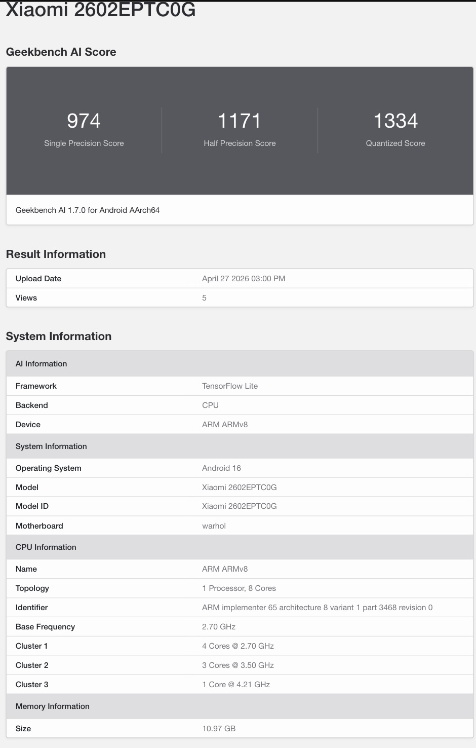 Recientemente, el Xiaomi 17T apareció en Geekbench. Ahora, la variante global de la Xiaomi 17T Pro con número de modelo "2602EPTC0G" también ha aparecido en Geekbench AI. El listado revela los detalles del chipset del próximo smartphone de gama alta.