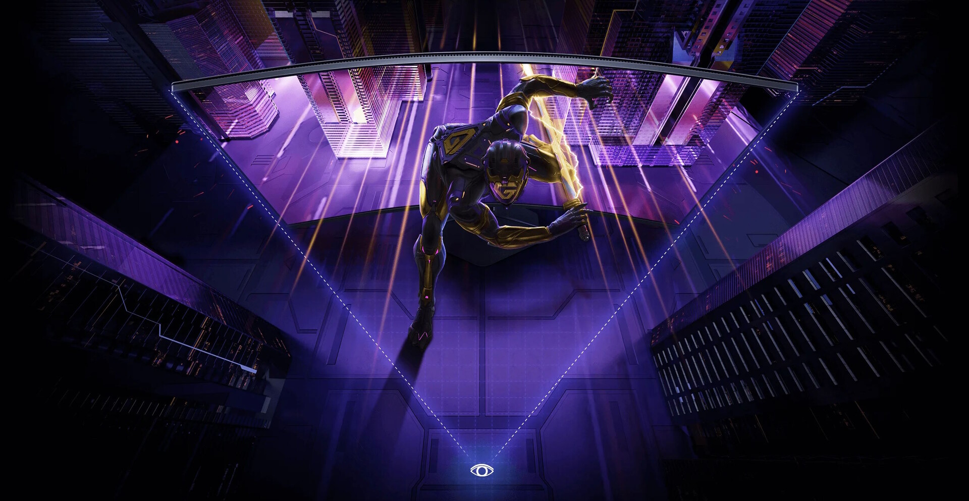 El panel trasero tiene un diseño llamativo y cuenta con iluminación RGB. Aquí se encuentran dos puertos HDMI y DisplayPort, pero ningún puerto USB. El monitor puede ajustarse en altura, girarse e inclinarse mediante el soporte incluido, y puede montarse en un soporte de pared o en un brazo de monitor mediante VESA. Por último, el monitor tiene un radio de curvatura de 1.500 milímetros