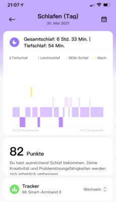 La Mi Band 6 no muestra ningún dato de sueño por sí misma. El registro del sueño de la aplicación Xiaomi Wear Lite es comparativamente pobre. No muestra la frecuencia cardíaca, aunque el aumento de la monitorización de la frecuencia cardíaca se habilitó específicamente para obtener datos de sueño más precisos.