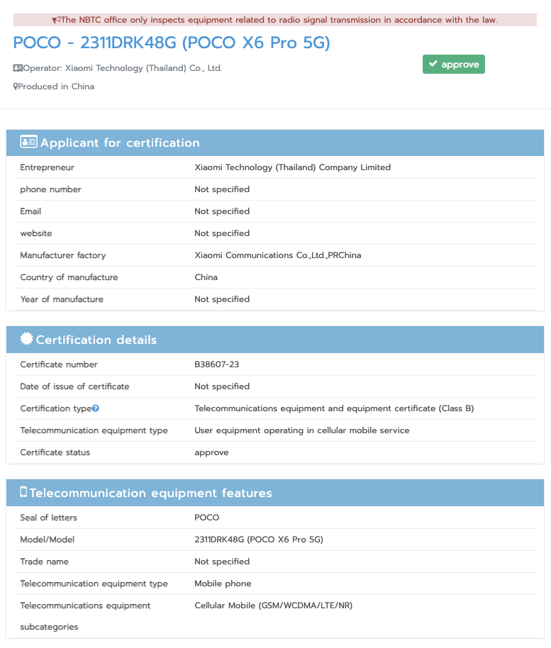 Varias fuentes han descubierto ahora una nueva referencia al 2311DRK48G, un próximo teléfono que Xiaomi pretende vender a escala mundial. Según la Comisión Nacional de Radiodifusión y Telecomunicaciones (NBTC) de Tailandia, el 2311DRK48G se refiere al POCO X6 Pro 5G, un modelo que se alineará como una alternativa más cara al POCO X6 5G. Basándose en rumores recienteseste último podría ser un rebautizado Redmi Note 13 Pro que Xiaomi lleva vendiendo en China desde finales de septiembre.