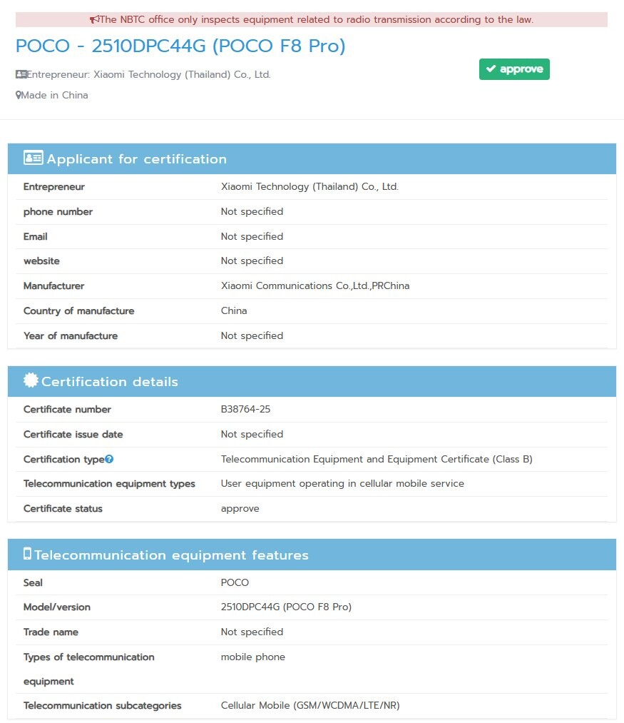 Por ahora, la compañía no ha revelado ningún detalle oficialmente. Sin embargo, ahora se ha confirmado la existencia del Poco F8 Pro a través de una certificación de la NBTC (Comisión Nacional de Radiodifusión y Telecomunicaciones) en Tailandia. La certificación no revela ninguna especificación clave del dispositivo. Sin embargo, confirma que el número de modelo "2510DPC44G" pertenece al Poco F8 Pro.