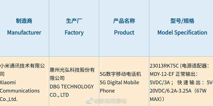 Xiaomi ha certificado el 23013RK75C con el 3C en China. Aunque el organismo regulador no ha revelado el nombre comercial del dispositivo, se cree que es el Redmi K60. Como muestra la captura de pantalla que aparece a continuación, el 23013RK75C ofrece hasta 67 W de carga rápida, reflejando el Redmi Note 12 Pro.
