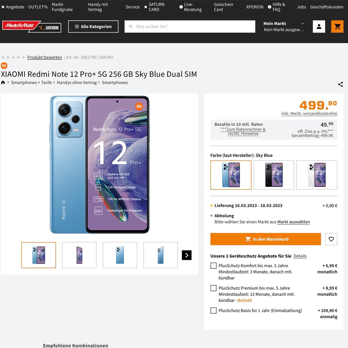 Sin embargo, MediaMarkt y Saturn listaron brevemente el Redmi Note 12 Pro Plus en sus sitios web antes de retirar rápidamente sus páginas. Como muestran las imágenes siguientes, el precio de Redmi Note 12 Pro Plus es de 499 euros, lo que coincide con las predicciones anteriores. Por cierto, @_snoopytech_ afirmó que el Redmi Note 12 estándar se lanzará por 279 euros, lo que supondría una diferencia de 229 euros en toda la serie Redmi Note 12.