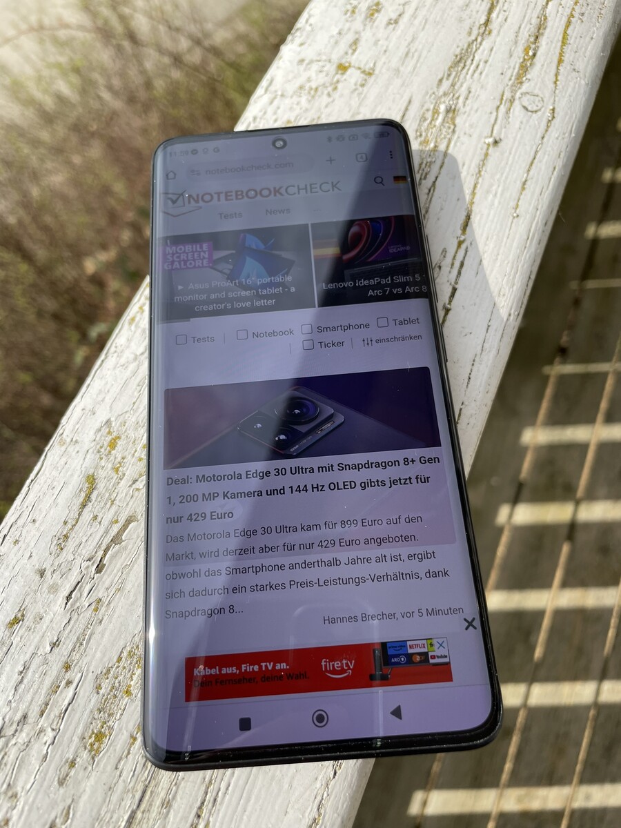 Al representar un fondo blanco puro, el panel AMOLED alcanza un brillo medio de 1233 cd/m², lo que significa que brilla más que la media para esta categoría de precio. Sin embargo, puede hacer aún más. Al mostrar incluso partes claras y zonas oscuras (medición APL18), su brillo máximo se eleva a 1714 cd/m², lo que se acerca bastante al valor de 1800 nits que especifica el fabricante. Al mostrar contenidos HDR, no pudimos obtener de la pantalla más de 1178 cd/m². Utilizando el ajuste de brillo más bajo, brilla a 2,36 cd/m².
