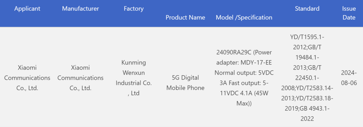 Anteriormente, no estaba claro con qué nombres comerciales estaban asociados estos números de modelo. Sin embargo, un reciente listado de 3C ha arrojado algo de luz sobre el 24090RA29C y dónde se sitúa en la pila de productos Redmi Note 14 de Xiaomi. Como muestra la imagen inferior, Xiaomi ha certificado el 24090RA29C con el MDY-17-EE, un cargador no lanzado que recibió la aprobación del 3C hace unos meses.