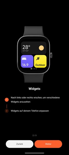 Dispositivo muestra una lista de los distintos dispositivos emparejados. Xiaomi ofrece una tienda con una amplia selección de esferas de reloj gratuitas. También pueden modificarse los ajustes del smartwatch emparejado, como qué aplicaciones pueden enviar notificaciones al reloj. También se pueden ajustar los parámetros de las lecturas de salud. La visualización de los widgets en el smartwatch también puede cambiarse a través del smartphone.