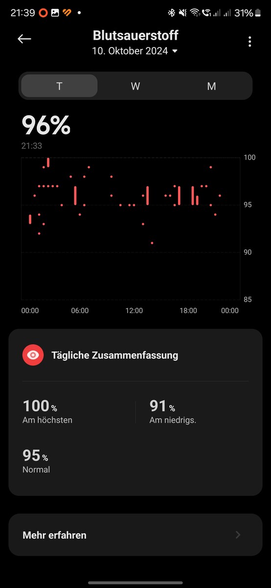 Un pulsioxímetro Braun 1 nos sirvió como dispositivo de referencia para las mediciones de saturación de oxígeno en sangre. La diferencia media de tres mediciones fue del 4,1 por ciento. Los valores medidos con la Smart Band 9 fueron siempre inferiores a los del dispositivo de referencia. La desviación máxima entre el rastreador y el dispositivo de referencia fue del 5 por ciento.