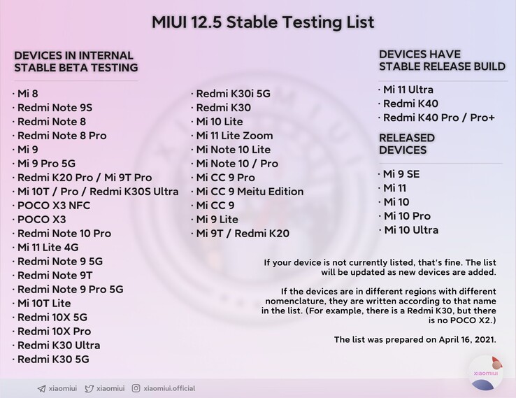 Sin embargo, Xiaomi & MIUI News afirma que Xiaomi planea llevar MIUI 12.5 a muchos más dispositivos que los dieciocho que ya han sido confirmados. Como es lógico, las series Mi 11 Ultra y Redmi K40, lanzadas recientemente, serán algunos de los próximos dispositivos en recibir MIUI 12.5. Al parecer, Xiaomi ya ha finalizado una compilación de lanzamiento estable para estos cuatro, mientras que otros treinta y cuatro se encuentran en la fase de pruebas beta estables de Xiaomi.