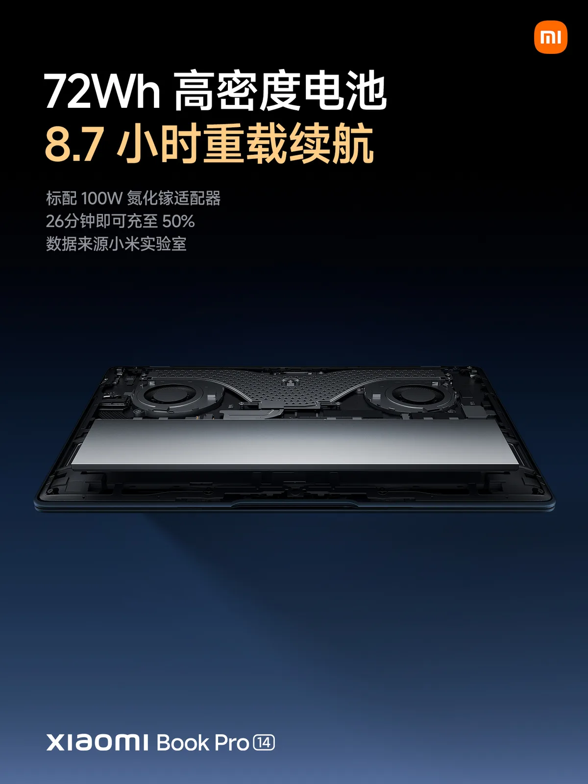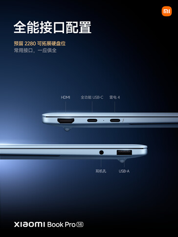 Además, Xiaomi instala una batería de 72 Wh con soporte para carga de 100 W para alimentar la pantalla OLED de 500 nit, 120 Hz y 3.120 x 2.080 píxeles del portátil. Xiaomi complementa esta pantalla 3:2 con un touchpad de 140 x 93 mm y teclas retroiluminadas que proporcionan 1,3 mm de recorrido de tecla. La Book Pro 14 contiene también puertos HDMI y USB Tipo-A de tamaño completo, a pesar de su delgado tamaño.