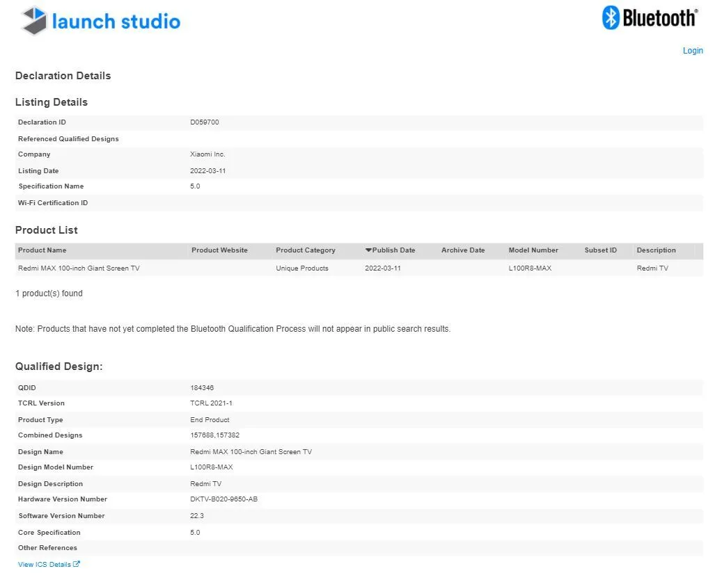 Un aparato con el número de modelo L100R8-MAX y el nombre de "Redmi MAX 100-inch Giant Screen TV" ha aparecido en la base de datos de certificación Bluetooth SIG. Según el listado, el dispositivo vendría con conectividad Bluetooth 5.0.