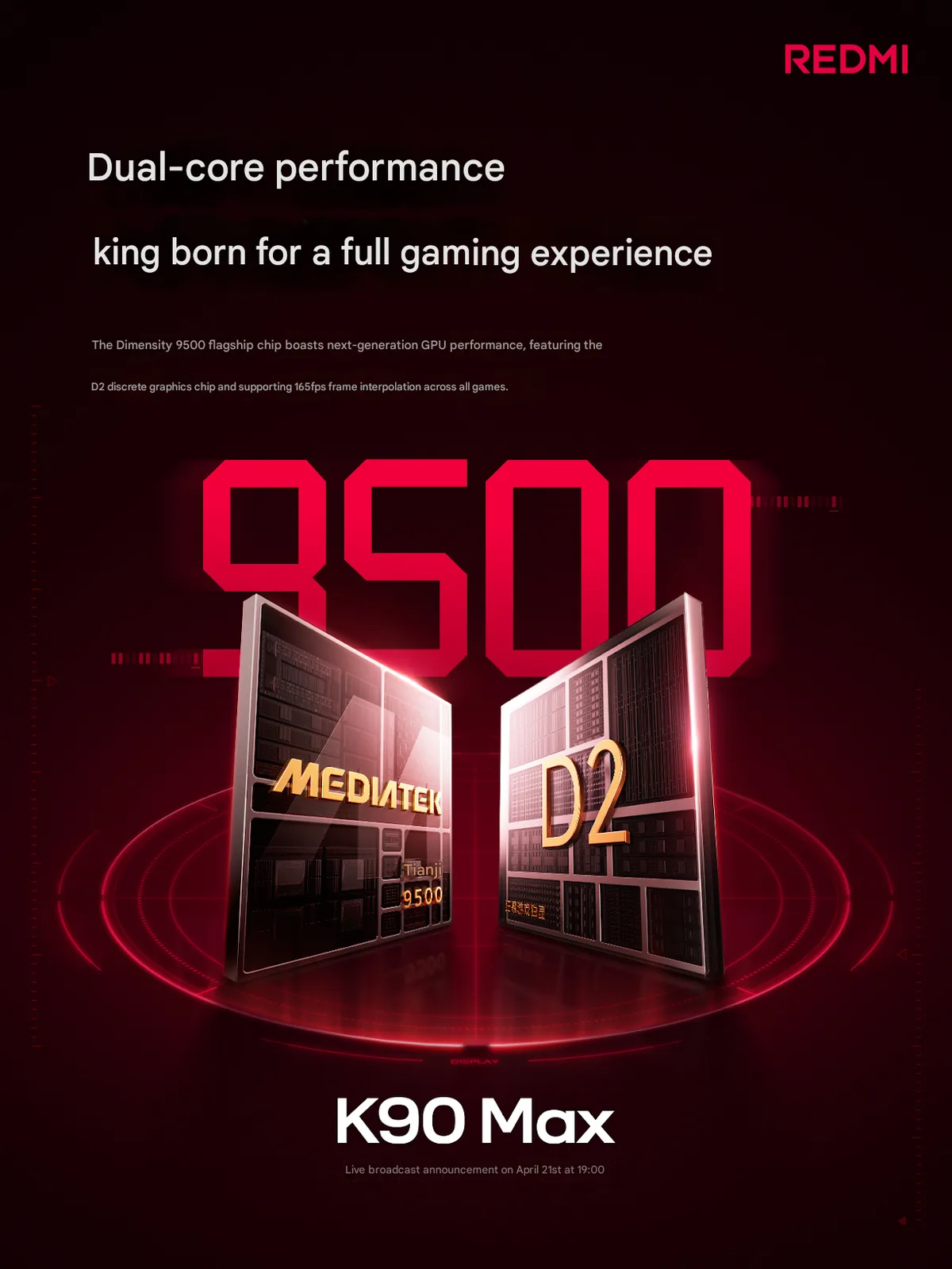 Tal y como ha confirmado Xiaomi, el Redmi K90 Max estará impulsado por el Dimensity 9500, El actual SoC insignia de MediaTek. Estará emparejado con el chipset gráfico dedicado D2. Junto con el refrigerador activo, esta combinación promete ofrecer una "experiencia de juego de primer nivel"
