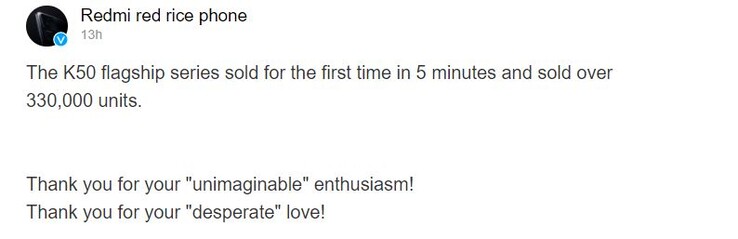 Según ha revelado Redmi en Weibo, la compañía vendió más de 330.000 unidades del Redmi K50 Pro en solo cinco minutos cuando salió a la venta por primera vez. Es una cifra impresionante y demuestra la gran demanda del teléfono en China. El Redmi K50 Pro cuesta a partir de 2.999 CNY, y la venta de más de 330.000 unidades supondría para Xiaomi más de 150 millones de dólares.