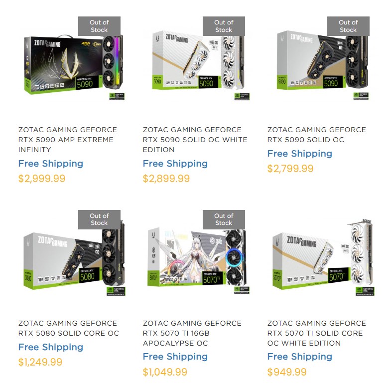Sin embargo, poco después de estas cancelaciones, ZOTAC volvió a poner a la venta sus GPU con precios significativamente más altos. Los informes afirman que la compañía subió los precios de sus RTX 5090 en cientos de dólares. Según los informes, algunos modelos pasaron de unos 2.299 dólares a 2.799 dólares, de 2.399 dólares a 2.899 dólares y de 2.449 dólares a casi 2.999 dólares. La RTX 5080 incluso experimentó un salto de unos 250 dólares.