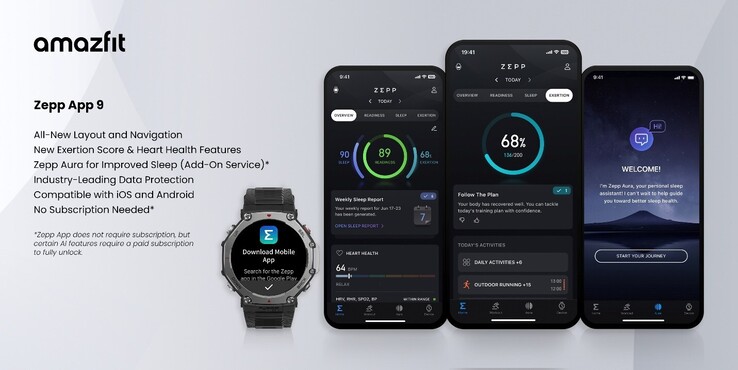 La empresa afirma que la nueva app ofrece una "interfaz optimizada" para facilitar su comprensión. Un panel de salud cardiaca proporciona más información sobre su estado cardiovascular, con datos biométricos que incluyen la frecuencia cardiaca, la variabilidad de la frecuencia cardiaca y los niveles de oxígeno y glucosa en sangre. Además, la nueva Puntuación de esfuerzo puede utilizarse para realizar un seguimiento de la recuperación de sus entrenamientos, con ejercicios recomendados que le ayudarán a mejorar su forma física. Además, existe una gama de funciones opcionales de pago, como el Zepp Aura Premium centrado en el sueño, con recomendaciones personalizadas de música para dormir y un asistente de sueño con inteligencia artificial.