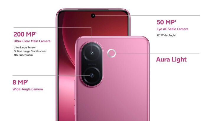 La cámara selfie de 50 MP f/2,0 con autofoco está situada en un orificio central. El módulo de cámara en forma de píldora de la parte trasera alberga la cámara principal de 200 MP f/1,88 y una cámara ultra gran angular de 8 MP f/2,2. En el interior del smartphone se encuentra un MediaTek Dimensity 7360 Turbo, que cuenta con cuatro núcleos de rendimiento ARM Cortex-A78 con velocidades de reloj boost de hasta 2,5 GHz y cuatro núcleos de eficiencia Cortex-A55. El smartphone se entrega con Android 15, y Vivo promete tres actualizaciones principales del sistema operativo y cinco años de parches de seguridad.