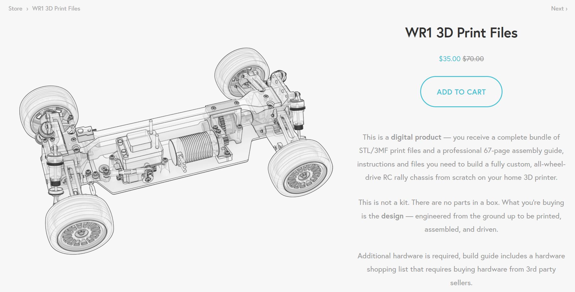 En un principio, todos los archivos de impresión, las instrucciones de montaje y las listas de piezas estaban disponibles de forma gratuita. Mientras tanto, el equipo ha empezado a vender al menos los archivos de impresión. Los archivos 3D del chasis -llamado WR1- cuestan actualmente 35 dólares.