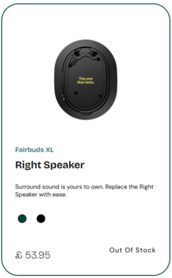 Mientras tanto, han aparecido muchas piezas de repuesto en la tienda en línea de Fairphone. Por ejemplo, un par de nuevos transductores para ambos modelos Fairbuds XL tienen un precio de 101,90 euros / 88,90 libras, costando algo más el transductor derecho porque alberga parte de la electrónica. Otros componentes listados incluyen una batería de repuesto (19,95 euros / 17,95 libras), almohadillas para las orejas (14,95 euros / 12,95 libras), así como la nueva diadema, el cable y la funda de tela para la diadema, con precios que oscilan entre los 15 euros / 13 libras y los 20 euros / 18 libras