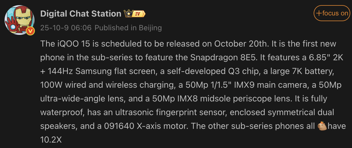 El iQoo 15 es el teléfono insignia de nueva generación de la compañía Android, que sucede al iQoo 13. La empresa china reveló previamente que el iQoo 15 estará impulsado por el último Qualcomm Snapdragon 8 Elite Gen 5 procesador. Ahora iQoo ha revelado la fecha de lanzamiento del teléfono en China.