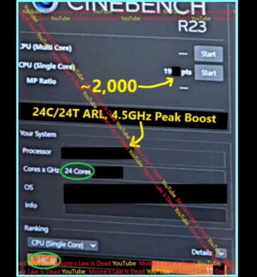 Tras su revelación del rendimiento Cinebench R23 Multi-Core de un 24-core Móvil Arrow Lake-HX CPU, Moore's Law Is Dead alega ahora el rendimiento mononúcleo de una CPU Arrow Lake. El chip Core Ultra de la serie 200 en cuestión parece ser el buque insignia Core Ultra 9 285K, ya que cuenta con 24 núcleos. Sabemos por filtraciones recientes que Intel sólo va a ofrecer un chip ARL-S de 24 núcleos, el Core Ultra 9 285Ky que los cuatro restantes serán los 20 núcleos Core Ultra 7 265K y el de 14 núcleos Core Ultra 5 245K SKUs.
