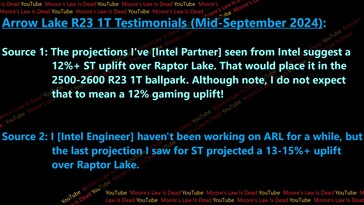 La puntuación filtrada de Cinbench R23 ST de Arrow Lake parece estar en línea con los números compartidos por las fuentes de MLID. Una fuente que supuestamente es un "socio de Intel" dijo al filtrador que Intel proyecta un aumento de más del 12% en un solo subproceso frente a Raptor Lake. Sin embargo, la fuente no cree que la ganancia se traslade uno a uno a los juegos. La segunda fuente que trabaja en Intel afirmó una cifra aún mayor, del 13-15%+.