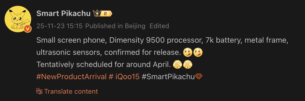 El informante sugiere que el iQoo 15 Mini se lanzará en torno a abril de 2026. Se espera que el año que viene lleguen más smartphones compactos, como el OnePlus 15T y el Oppo Find X9s. Además, se espera que Honor lance el Magic 8 Mini.