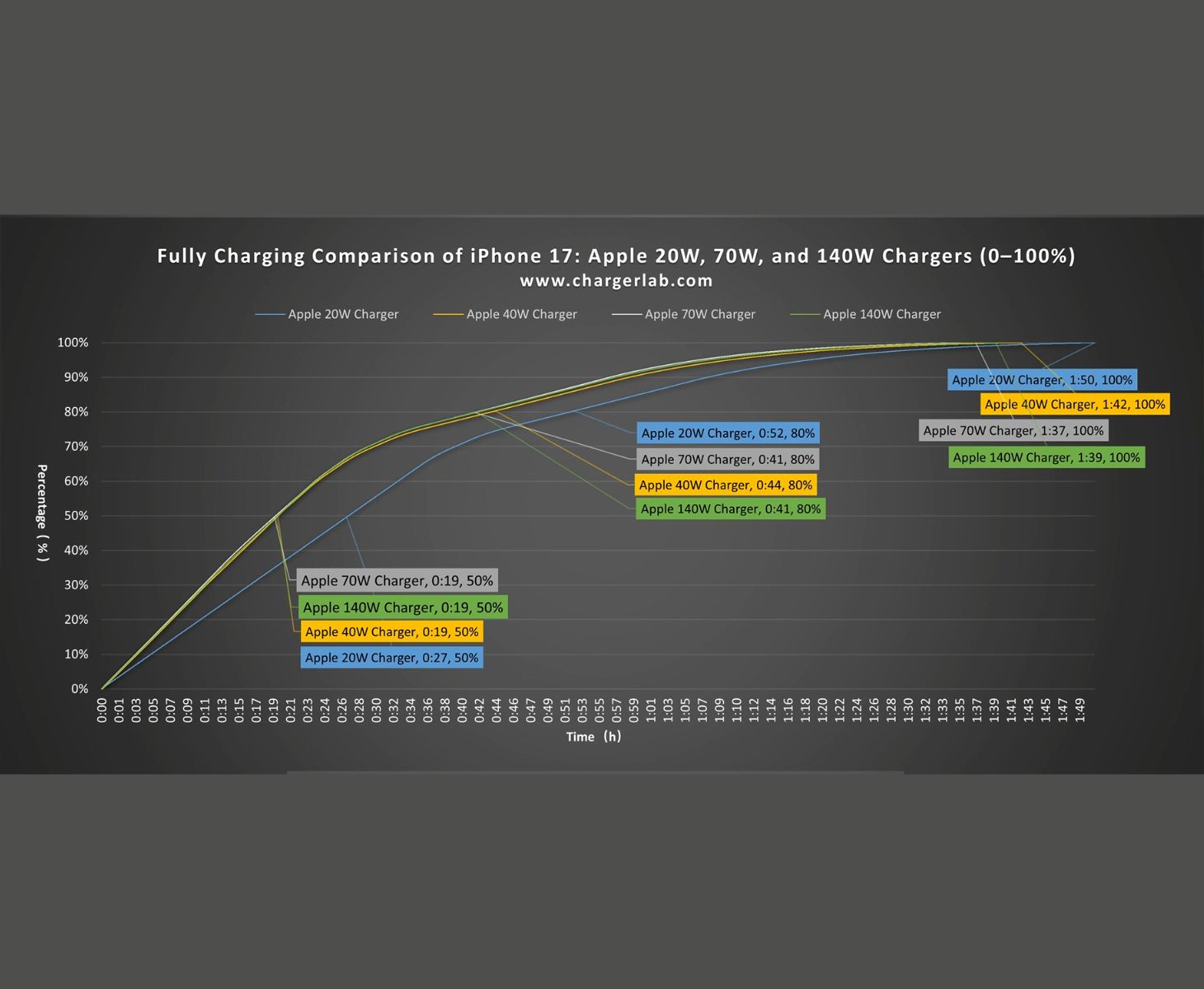 Cuando se trazan juntas, las curvas de carga de los adaptadores de 40 W, 70 W y 140 W parecen casi idénticas, con el iPhone 17 alcanzando el 50 % en 19 minutos, el 70 % en 30 minutos, el 80 % en 41 minutos y una carga completa en 1 hora y 39 minutos.